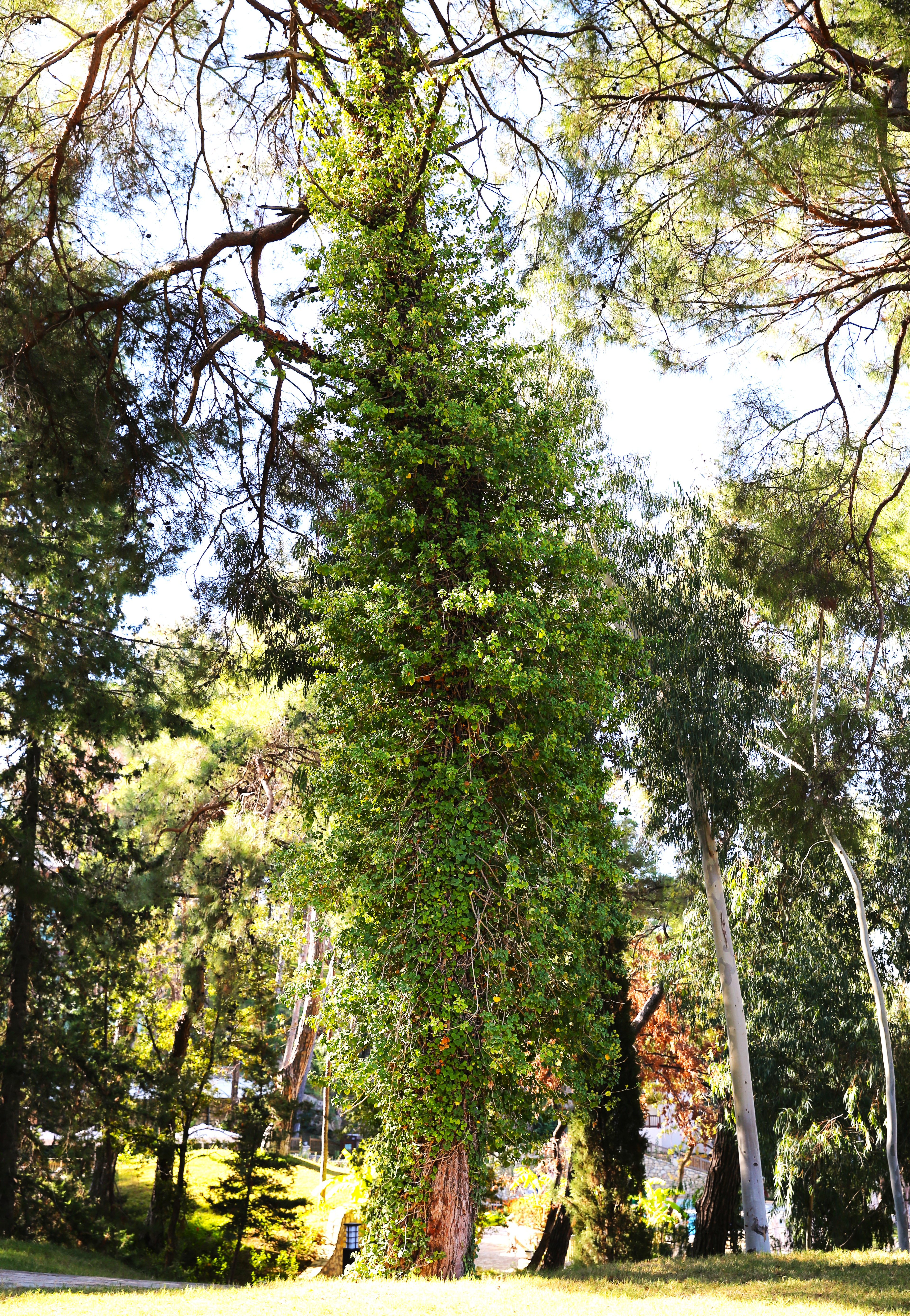 Doğal peyzaj ve park alanlarında, ağaçların gövdesi boyunca yönlendirilerek görsel süreklilik sağlanabilir. Yaprak döken ağaçlarla beraber kullanıldığında, özellikle kışın yeşil dokunun korunmasına katkısı olur. Bitkinin genç ve zayıf ağaçlarda yoğun gelişimi, ışık ve hava rekabeti yaratabilir. Bu nedenle tasarımda, dikkatli planlama gerekir.